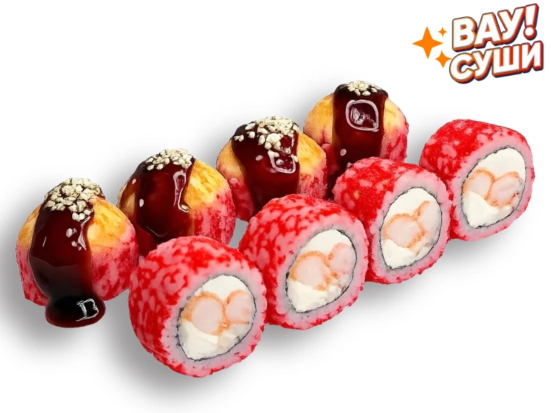 Состав: рис, нори, сливочный сыр, тигровая креветка, икра масаго, соус унаги, кунжут