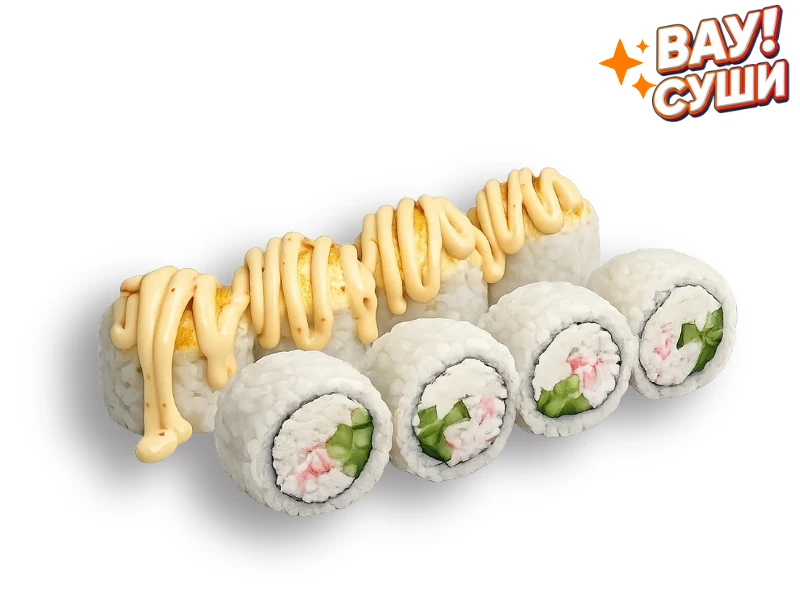 Состав: Рис, нори, сливочный сыр, огурец, краб, тигровая креветка, икра летучей рыбы, моцарелла, фирменный соус