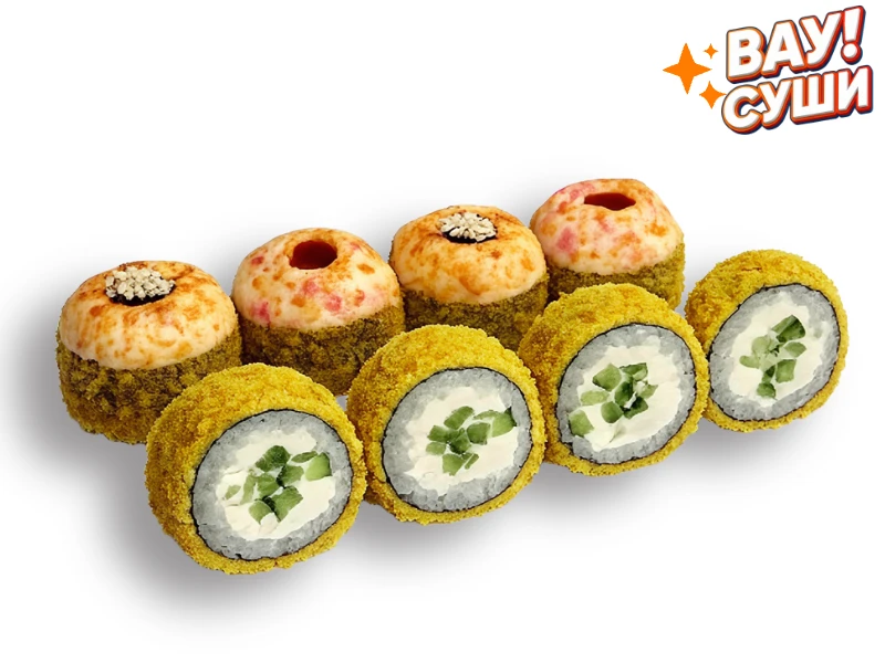 Состав: рис, нори, сливочный сыр, огурец, тигровая креветка, лосось, икра летучей рыбы, унаги соус, шрирача соус, кунжут