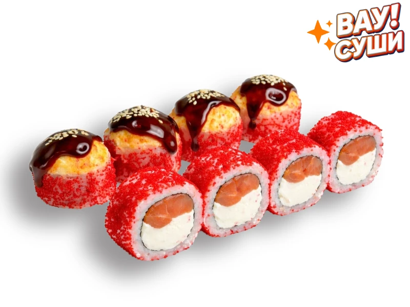 Состав: рис, нори, лосось, икра масаго, сыр сливочный, соус унаги, кунжут Вес: 360